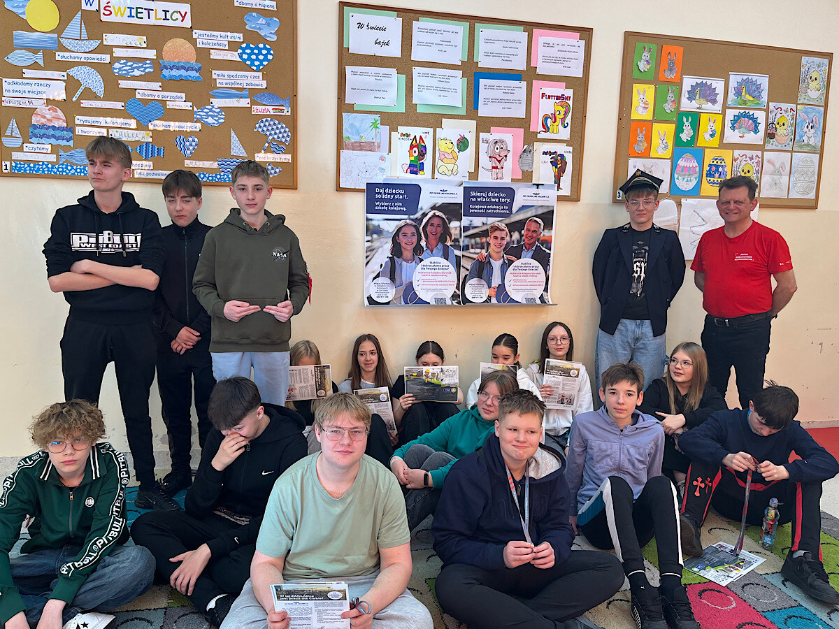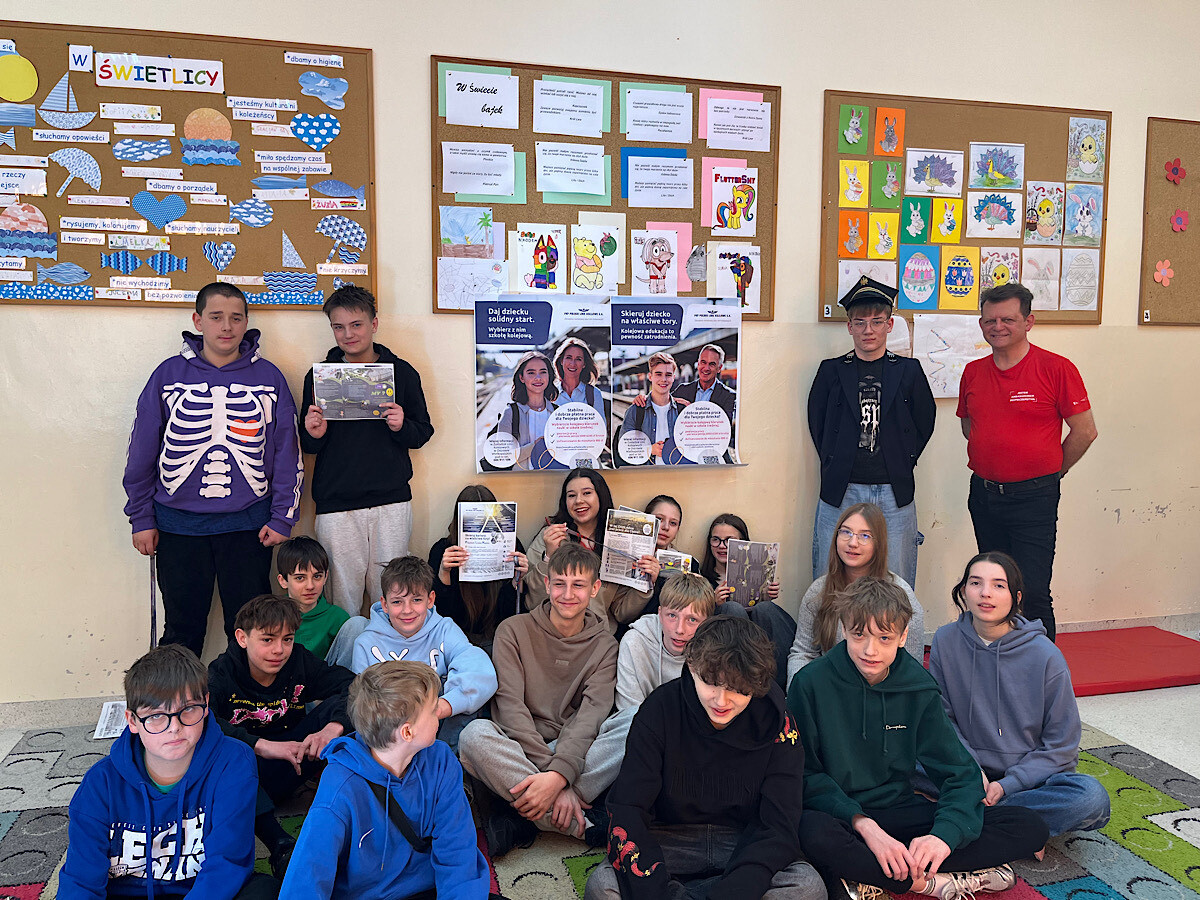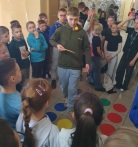 Kolejarz na zajęciach dla dzieci z Ukrainy. Dzieci, uczestnicząc w zajęciach języka polskiego, mają możliwość poznawania różnych zawodów i słów z nimi związach. Tym razem uczyły się nazewnictwa związanego z zawodem kolejarza. Bawiły się doskonele, ucząc jednocześnie!