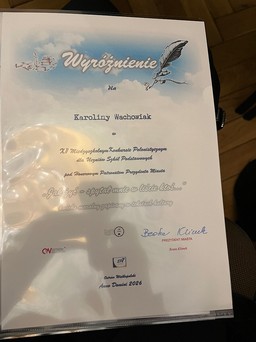 XII Międzyszkolny Konkurs Polonistyczny. 22 stycznia 2026 roku w Szkole Podstawowej nr 7 w Ostrowie Wielkopolskim odbył się konkurs języka polskiego. Podczas pierwszego etapu uczniowie rozwiązywali test złożony z zadań dotyczących literatury oraz nauki o języku. Tworzyli również formę wypowiedzi pisemnej. Etap ustny odbył się 12 lutego 2026 roku. Komisja po wysłuchaniu odpowiedzi uczniów zsumowała punkty za część pisemną i ustną oraz przygotowała listę zwycięzców, którą ogłosiła 19 marca 2026 roku. Miło nam poinformować, że Karolina Wachowiak z klasy 8b otrzymała wyróżnienie. Ogromne gratulacje! Kochani uczniowie, kolejna edycja za rok-zapraszamy do wzięcia udziału w konkursie.