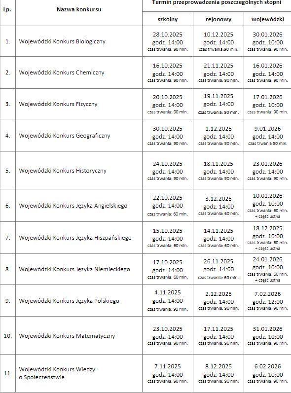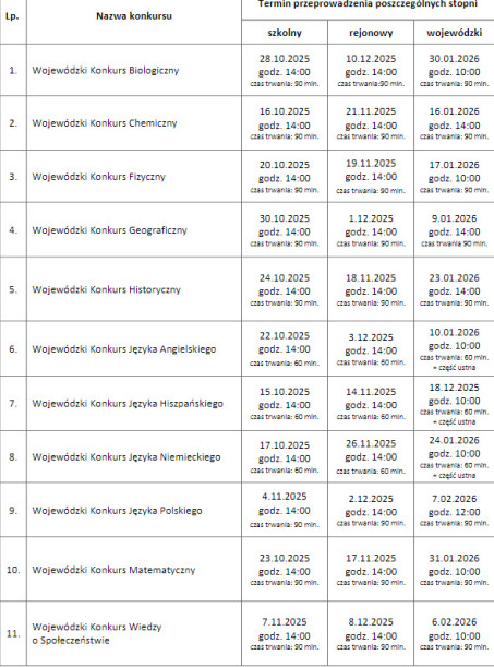 Terminarz wojewódzkich konkursów przedmiotowych organizowanych dla uczniów