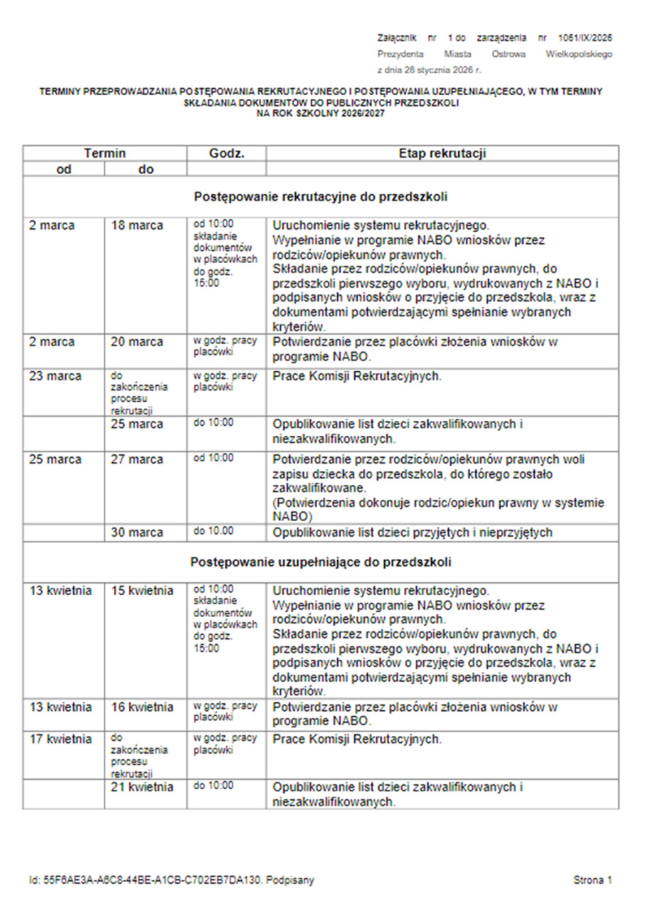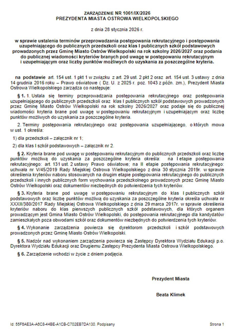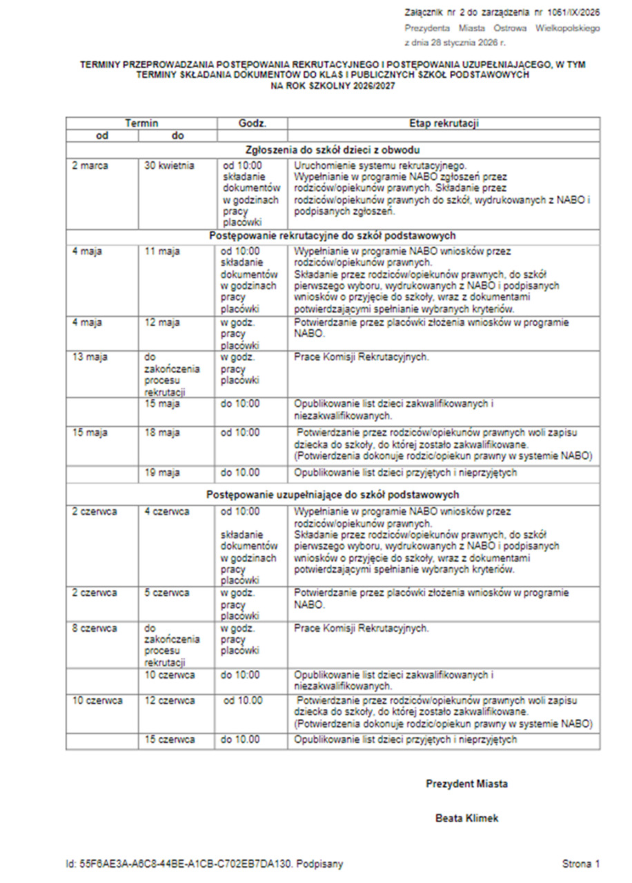 Uprzejmie informujemy, że zostanie system elektronicznego naboru do szkół podstawowych. Będziecie mogli Państwo zapisywać dzieci, rejestrując się po kliknięciu na logo naszej szkoły. Można także zlecić dokonanie zapisu w Państwa imieniu, w sekretariacie szkoły, od poniedziałku do piątku. W razie wątpliwości lub niejasności prosimy o kontakt z sekretariatem tel.62 735 17 13. Wszelkie informacje o naborze na rok szkolny 2026/2027 uzyskacie Państwo po kliknięciu na ten adres: